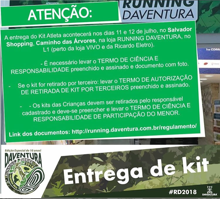 Os kits estão sendo entregues na Loja do Running Daventura, localizada no primeiro piso do Salvador Shopping (perto da loja VIVO e da Ricardo Eletro).