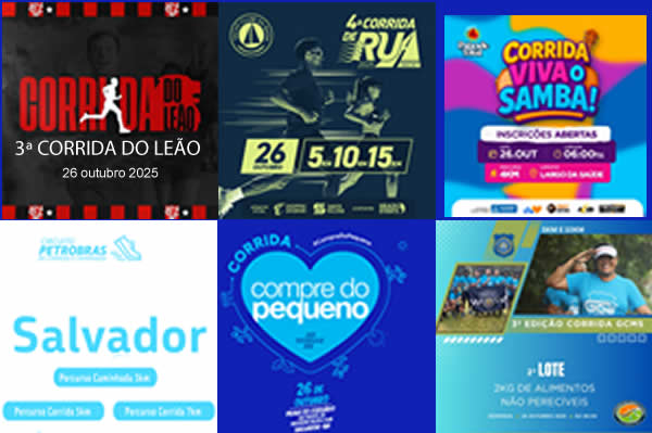 De forma absolutamente inédita, Salvador realizará neste domingo, dia 26 de outubro de 2025, seis corridas de rua simultâneas na cidade, São elas: 4ª Corrida de Rua do Yacht, 3ª Corrida do Leão, 3ª Corrida da Guarda Civil de Salvador, 1ª Corrida Viva o Samba, Circuito Petrobrás de Corrida e Caminhada e a Corrida Compre do Pequeno.